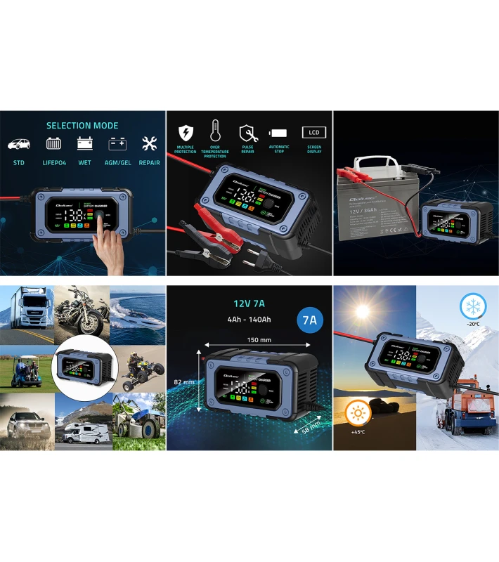 Έξυπνος εξελιγμένος φορτιστής-συντηρητής μπαταριών, ελεγχόμενος από μικροεπεξεργαστή, για 12Volt μπαταρίες με οθόνη LED. Τεχνολογία 3 σταδίων φόρτισης με έλεγχο σταθερού ρεύματος και σταθερής τάσης. Σχεδιασμένοι ώστε να φορτίζουν με τον πιο σωστό τρόπο, πλήθος μπαταριών, εξασφαλίζοντας τη σωστή τους απόδοση, επιμηκύνοντας το χρόνο ζωής τους, διατηρώντας τα χαρακτηριστικά τους. Συμβατοί με όλους τους τύπους μπαταριών οξέος μολύβδου, AGM, GEL, SLA και WET, που χρησιμοποιούνται σε διάφορα οχήματα, όπως αυτοκίνητα, μοτοσικλέτες, φορτηγά, τροχόσπιτα και σκάφη