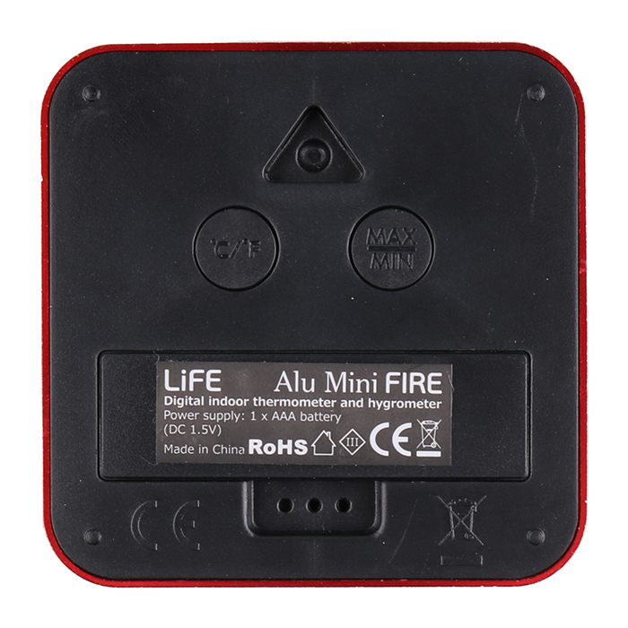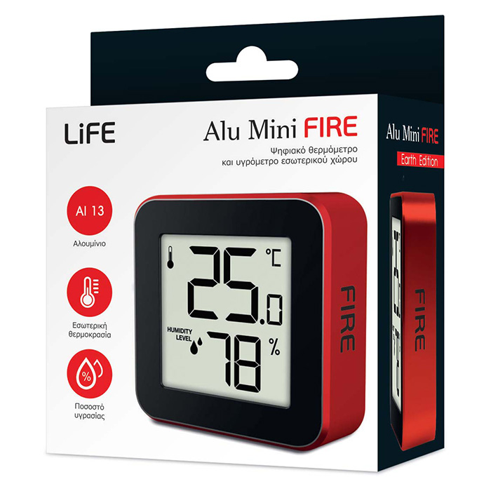 LIFE ALU MINI FIRE Ψηφιακό θερμόμετρο και υγρόμετρο εσωτερικού χώρου, με πλαίσιο αλουμινίου σε κόκκινο χρώμα .